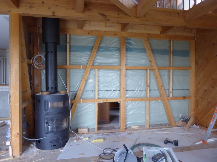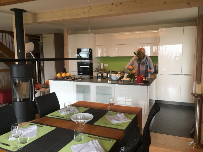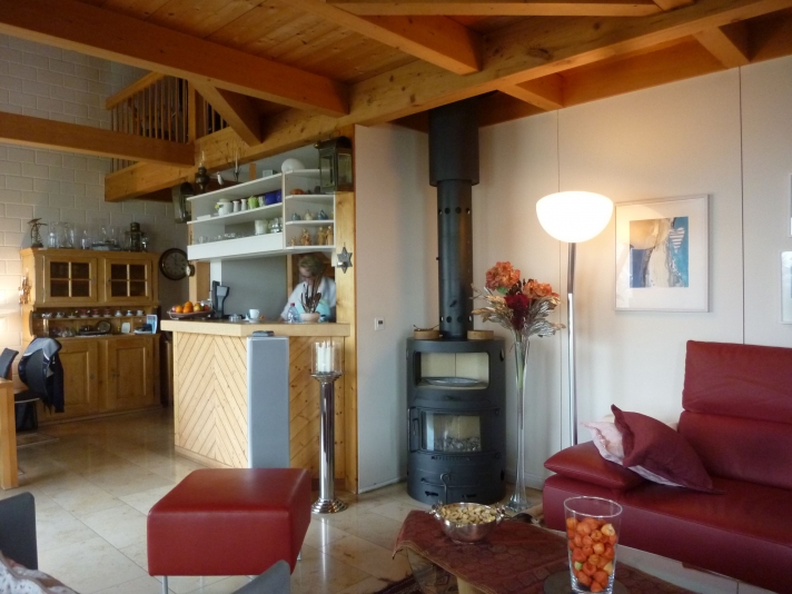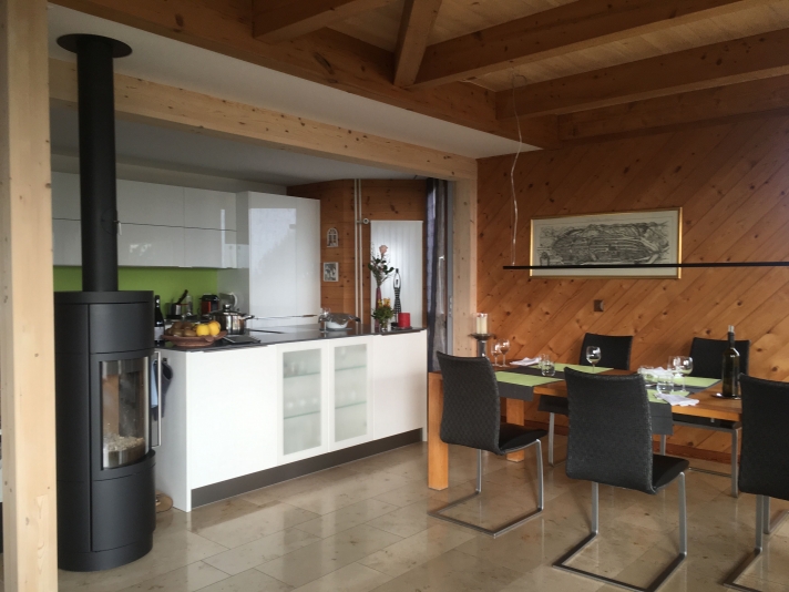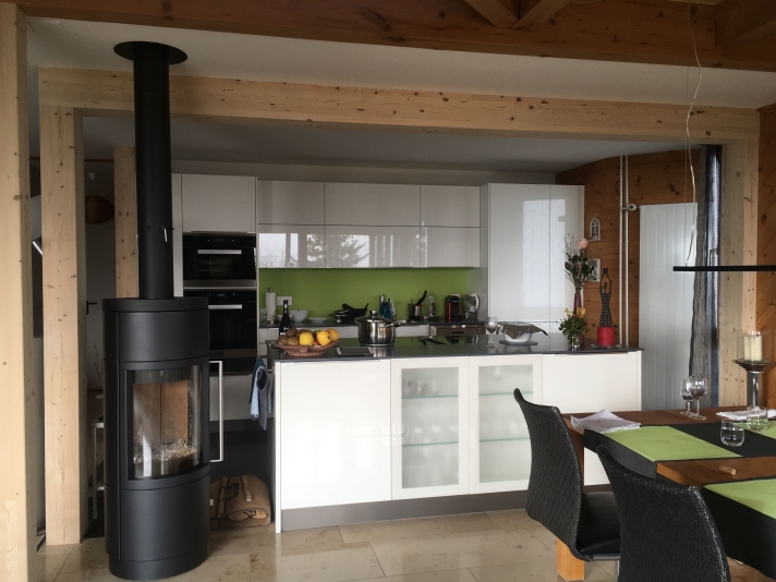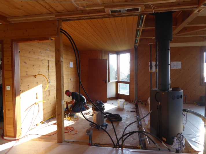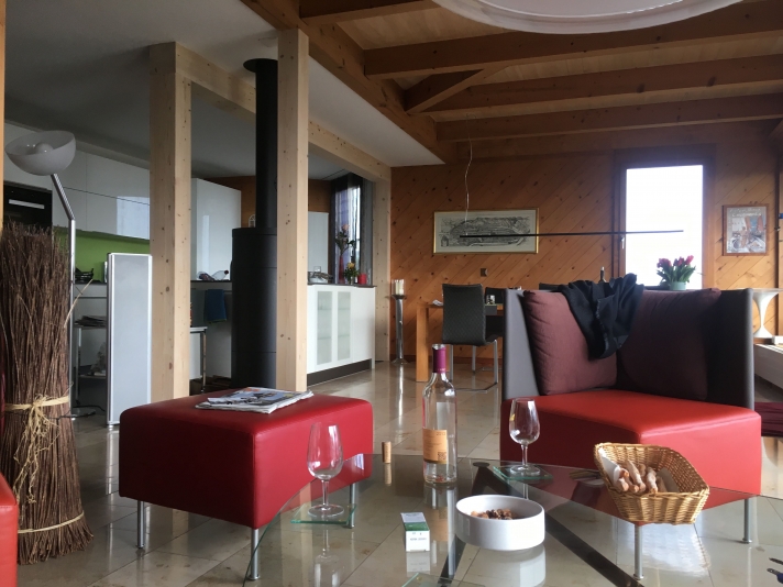 Ausbruch einer tragenden Wand. Vergrösserung Wohn-, Koch- und Essbereich. Einbau eines Galeriebodens auf bestehende Balkenlage, als Ersatz für das preisgegebene Büro.