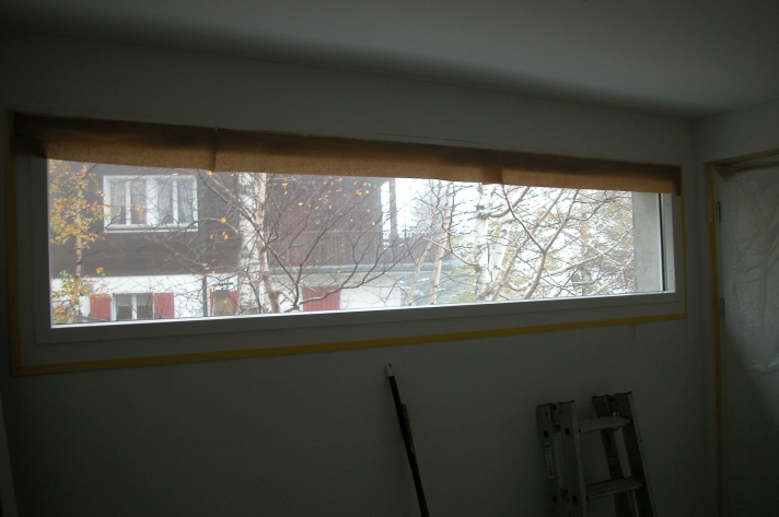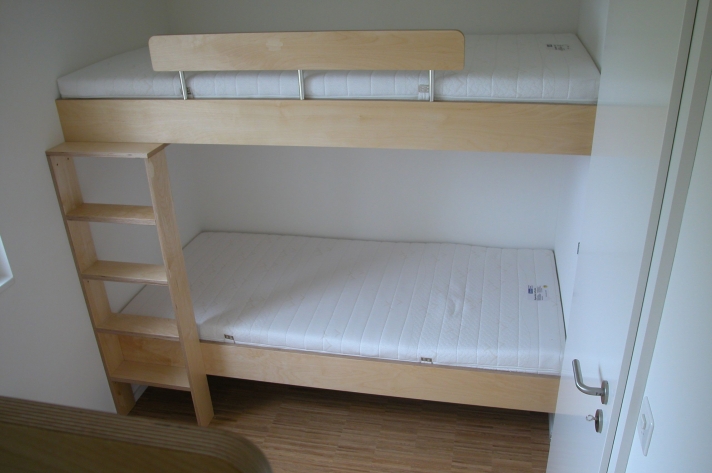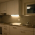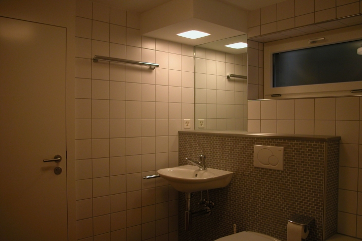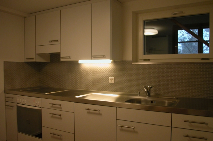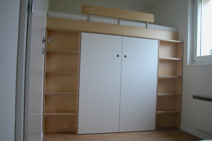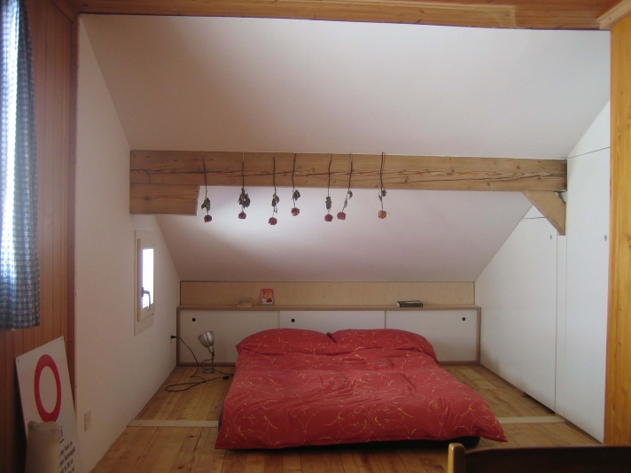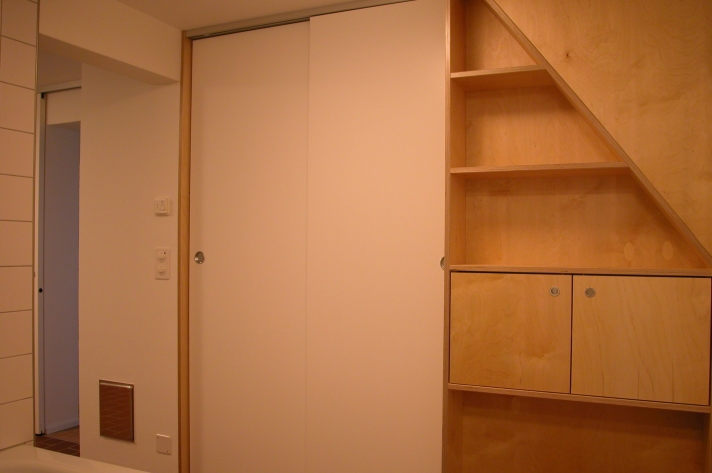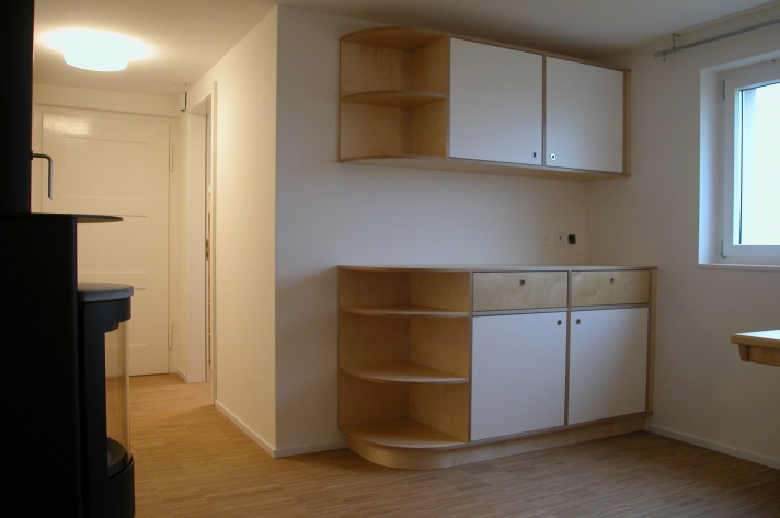 Kellerraumes entstehen grösseres Bad und neue Küche. Der verlorene Stauraum wird nordseitig im Sockelgeschoss, als neuen Windfang wieder angebaut. Darüber befindet sich das Holzlager für die beiden neuen Schwedenöfen. Dieser obere Teil des Anbaus, ist mit einem Steg zum Trottoir hin verbunden. Die Einliegerwohnung wird möbliert vermietet. Neu gestaltete, platzsparende Einbaumöbel in geöltem Birkenmultiplex und gespritztem MDF, ersetzen die bestehenden Massivholzeinbauten.