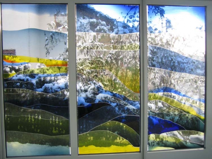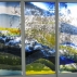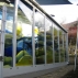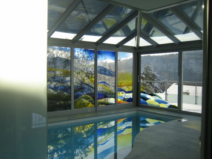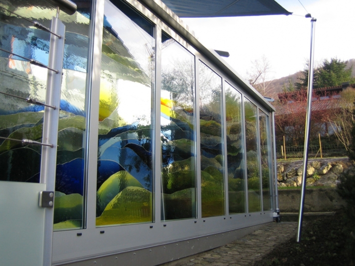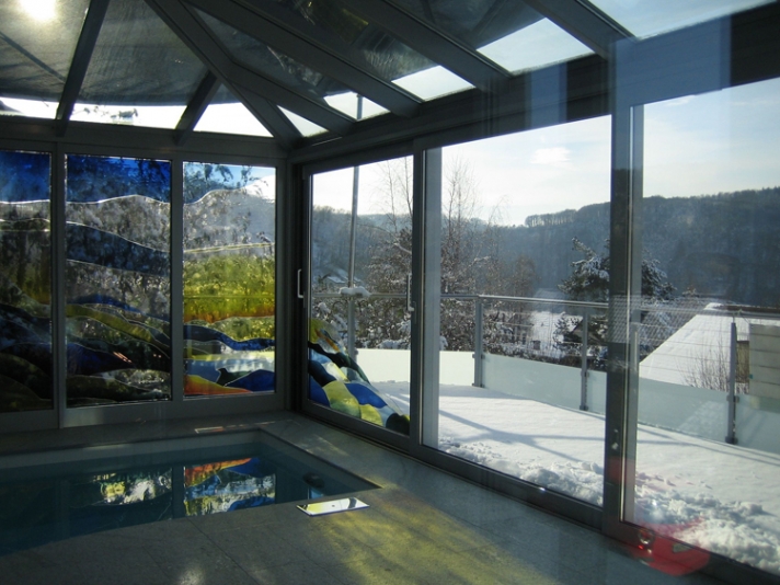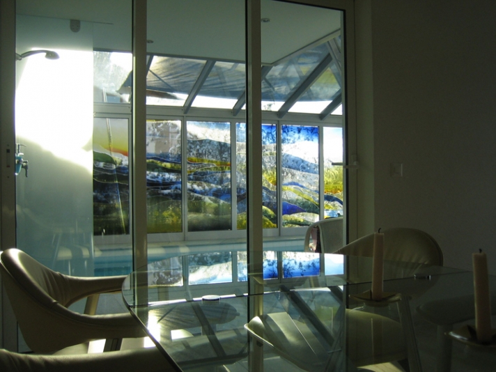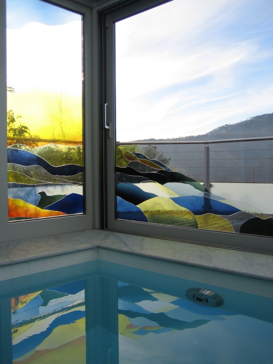 Die Längsseite des neuen Wintergartens wird geprägt durch ein Bild des Luzerner Künstlers Franz Bucher. Die nach seinem Entwurf eigens in Tschechien gefertigten und vom Atelier Christof Stooss ausgeschnittenen farbigen Scheiben, wurden Stück für Stück auf die neue Isolierverglasung geklebt.