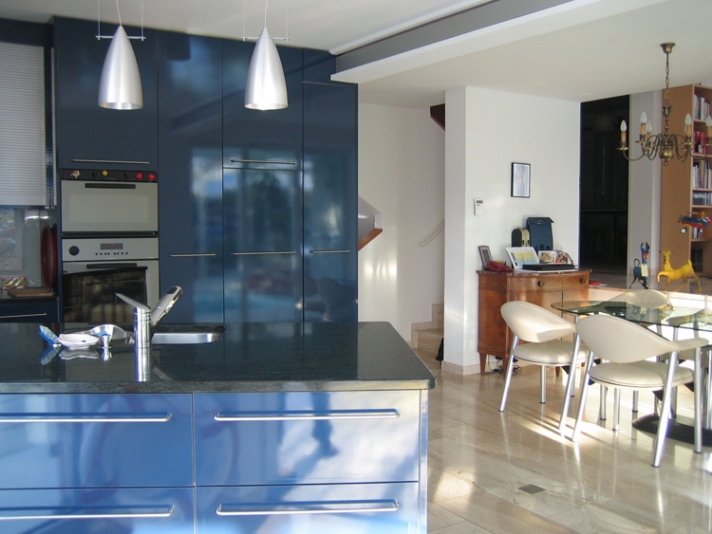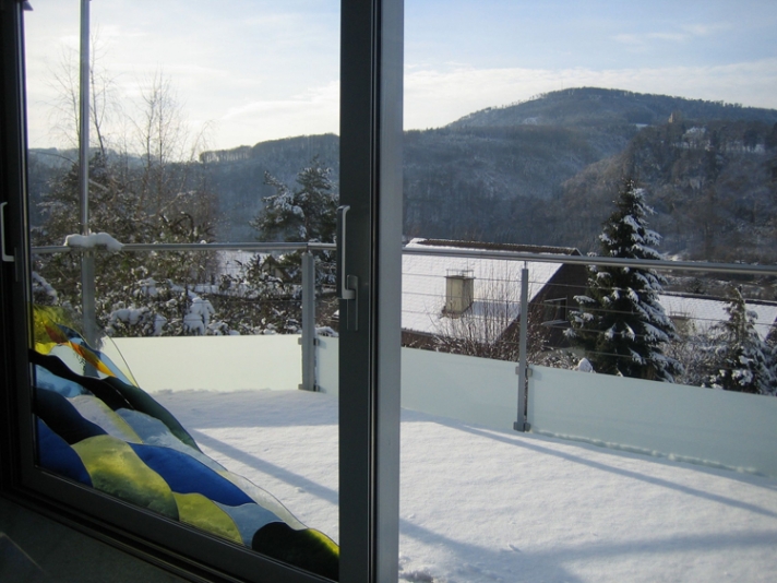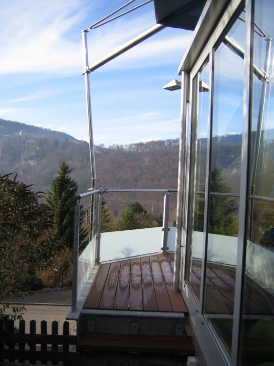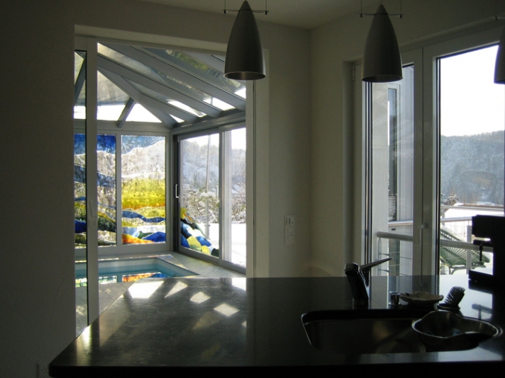 Mit dem Eingriff an der Südseite des Einfamilienhauses werden gleichzeitig bestehende Mängel in den angrenzenden Wohn- und Aussenräumen behoben. Beispielsweise wird die Trennwand zwischen Küche und Essplatz herausgebrochen und die darüberliegenden Lasten mit einem Stahlträger abgefangen. Die Auskragung des eingeschobenen Trägers, dient als Auflager für die Stahlkonstruktion des neuen Wintergartens. Neue Fensteröffnungen und Sitzplätze machen die wunderbare Aussicht erlebbar, die vorher im Seriendoppelhaus weitgehend ignoriert wurde.