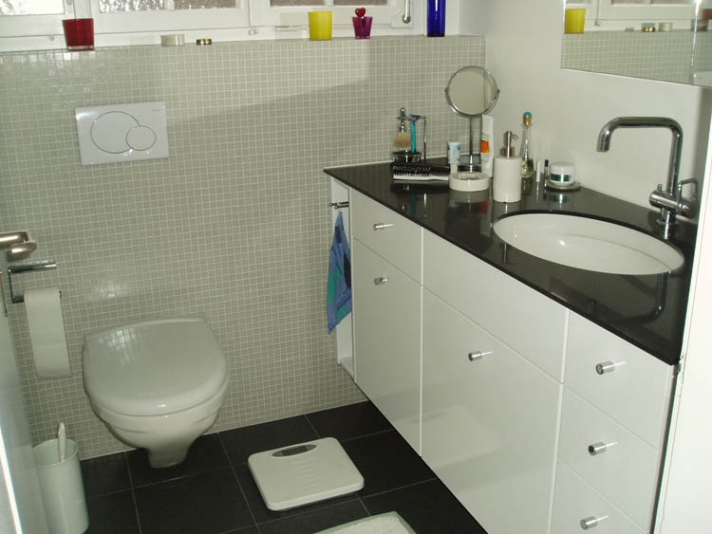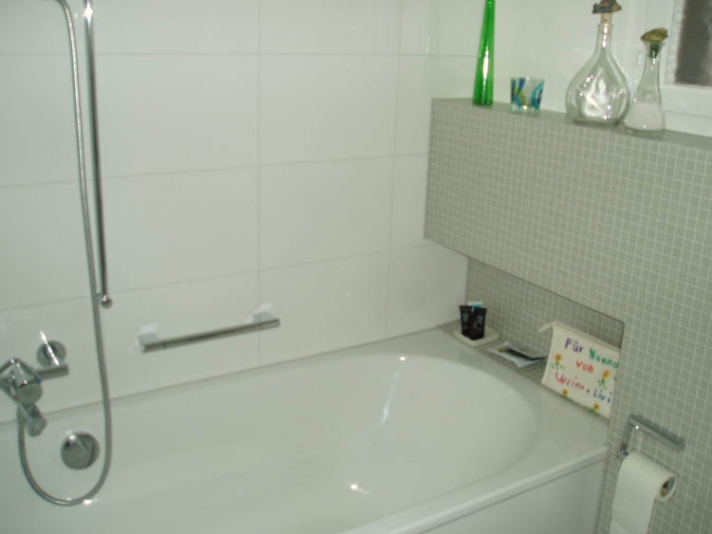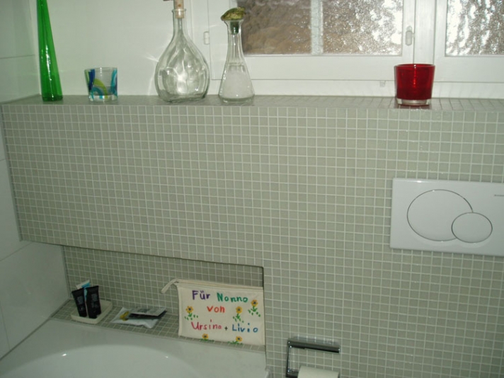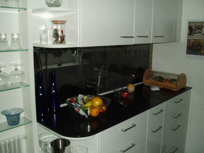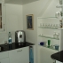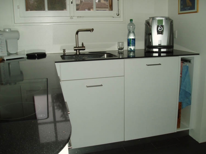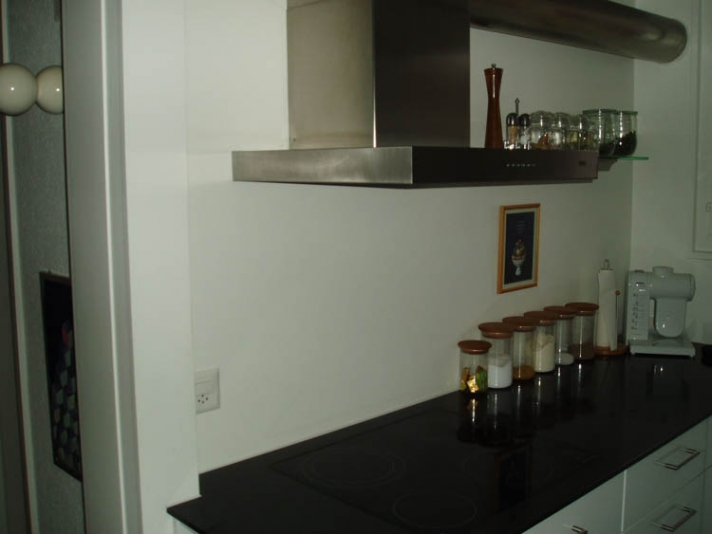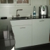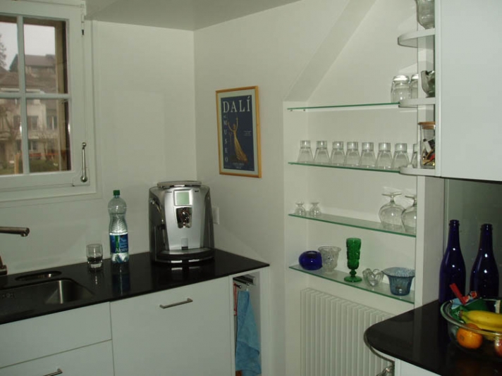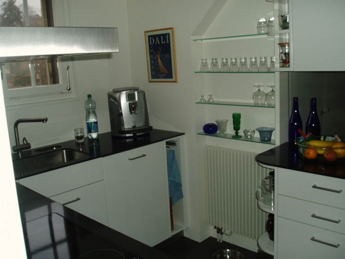 Erneuerung des Küchen- und Badbereichs. Optimierte Kleinküche mit Verglasung zwischen Ober- und Unterschrank zum angrenzenden Wohnbereich.