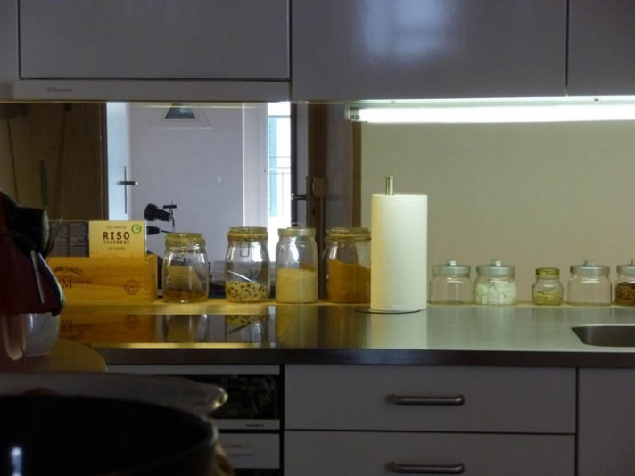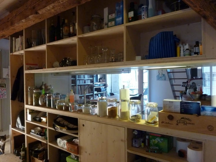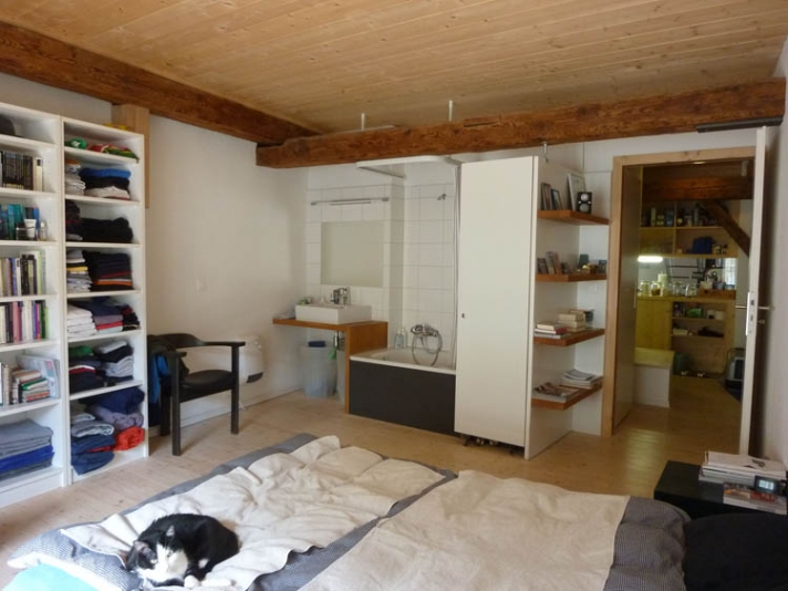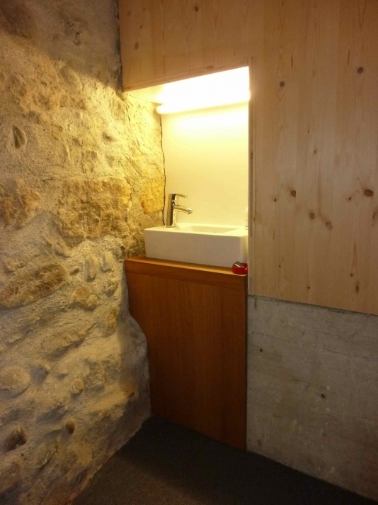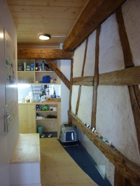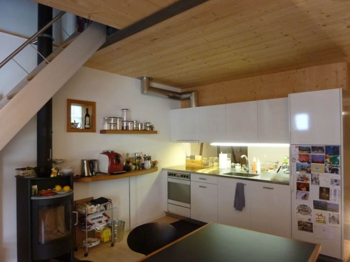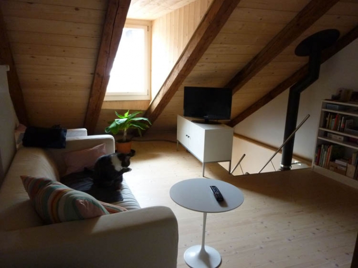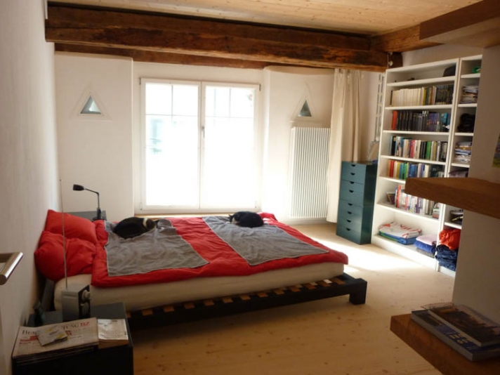 Sensible Einpassung der neuen Nutzung in die historische Hülle: Bürogemeinschaft im Erdgeschoss, Wohnung und Ferienwohnung im Ober- und Dachgeschoss. Wärme- und energietechnische Sanierung, soweit mit den strengen Schutzauflagen vereinbar (neue Erdsondenwärmepumpe, gute Isolation des Daches). Minimale Eingriffe in den Fassaden, die für die Belichtung der Wohn- und Arbeitsräume enorm wichtig sind und trotzdem das Gesamterscheinungsbild nicht beeinträchtigen.