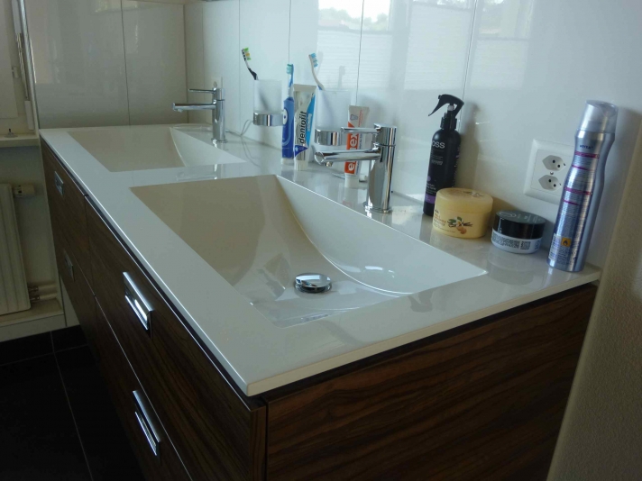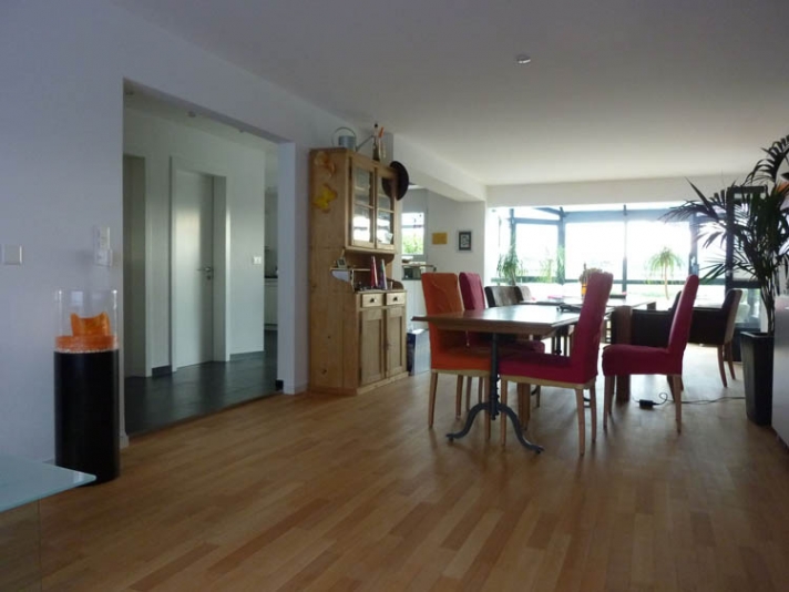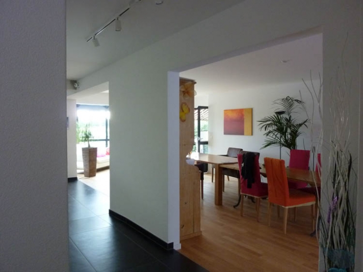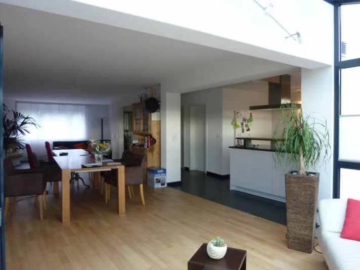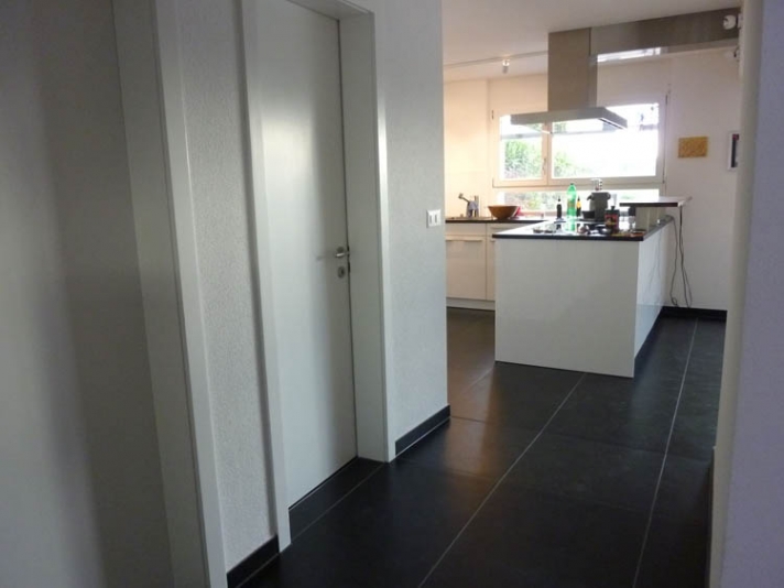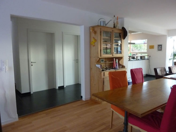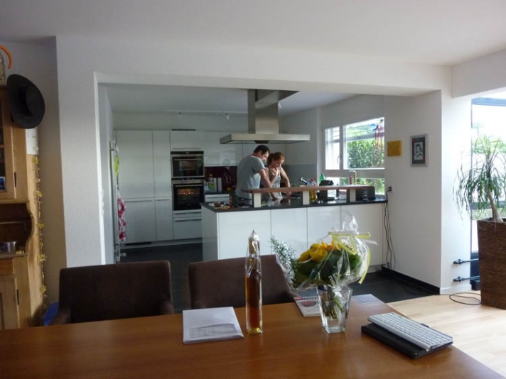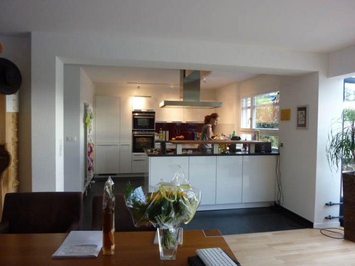 Innere Aufwertung eines demodierten Einfamilienhauses aus den Achzigerjahren. Neue, dem Wohnbereich angegliedert Küche (Ausbruch der Küchentrennwand mit Abfangung der Lasten). Neue Nasszonen. Auffrischung, bzw. Ersatz der Bodenbeläge.