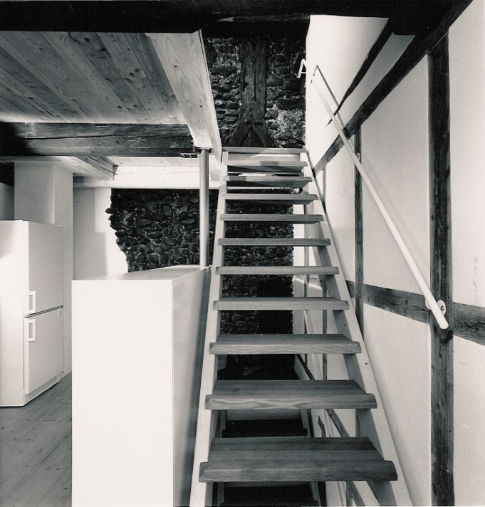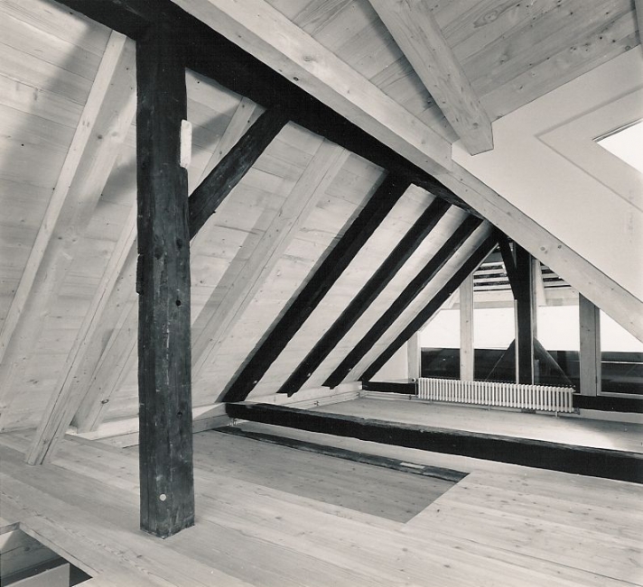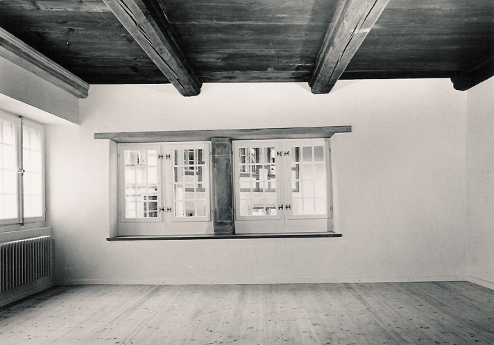 werden neu mit Gasbetonsteinen ausgemauert. Im Innern müssen die tragenden Riemenböden ausgewechselt und die Treppen neu (und weniger steil) wieder eingebaut werden. Erforderlich ist auch eine totale Neuinstallation von Heizung-Sanitär-Elektro. Zudem wird der Rückbau von später hinzugekommenen Fassaden-und Dachteilen beschlossen. An Stelle des abgebrochenen WC-Turms entsteht ein neuer Balkon als einziger Aussenraum des Gebäudes.